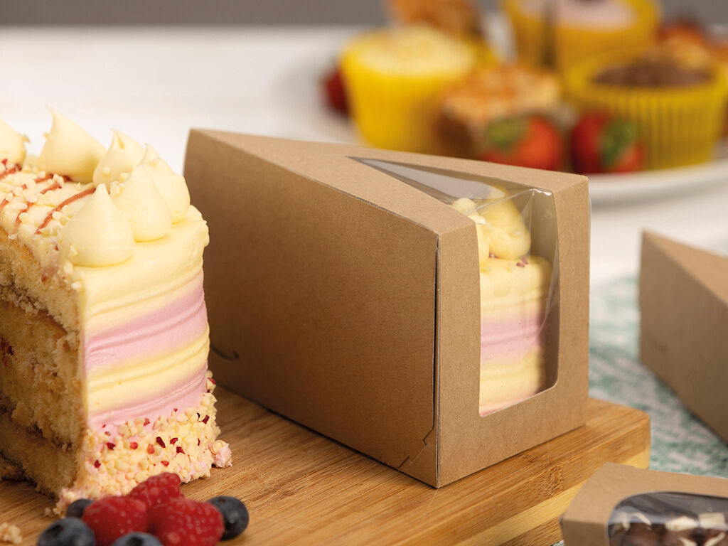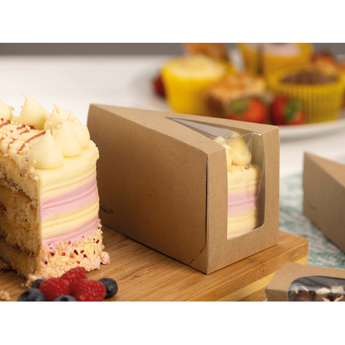 This large 'Piece of Cake' wedge in kraft is ideal for individually packaging a single, large piece of cake.