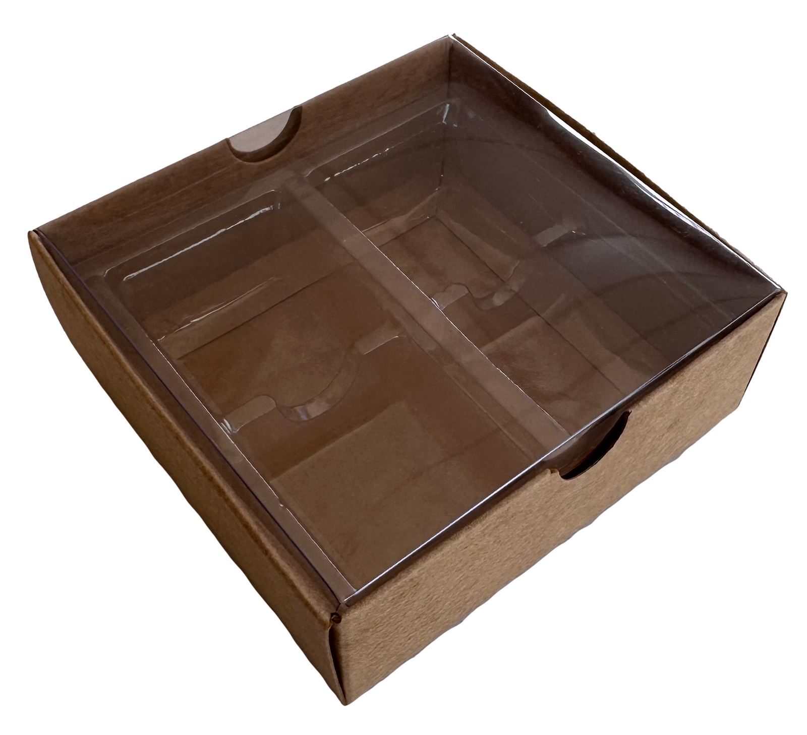 • A stylish box - Kraft base and clear lid with tray to suit 4 chocolates