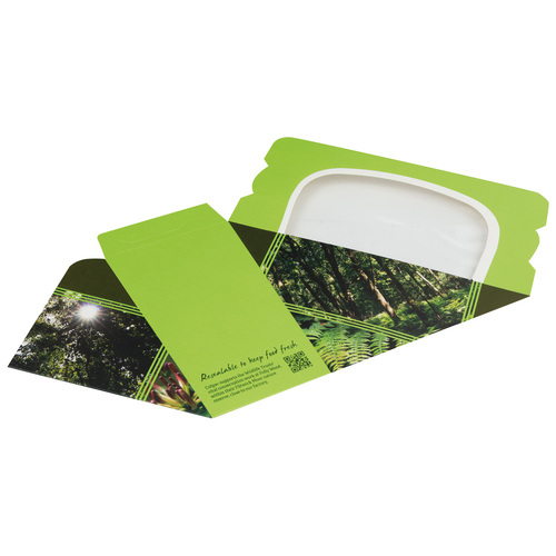 The triangular Self-seal Sandwich Pack is made of paperboard and has a grease-resistant coating. The paperboard is recyclable and biodegradable. The clear window is compostable. A special feature of this pack is its self-seal function that makes it easy to close and re-close. There are also additional closing flaps attached to the upper and bottom sides.